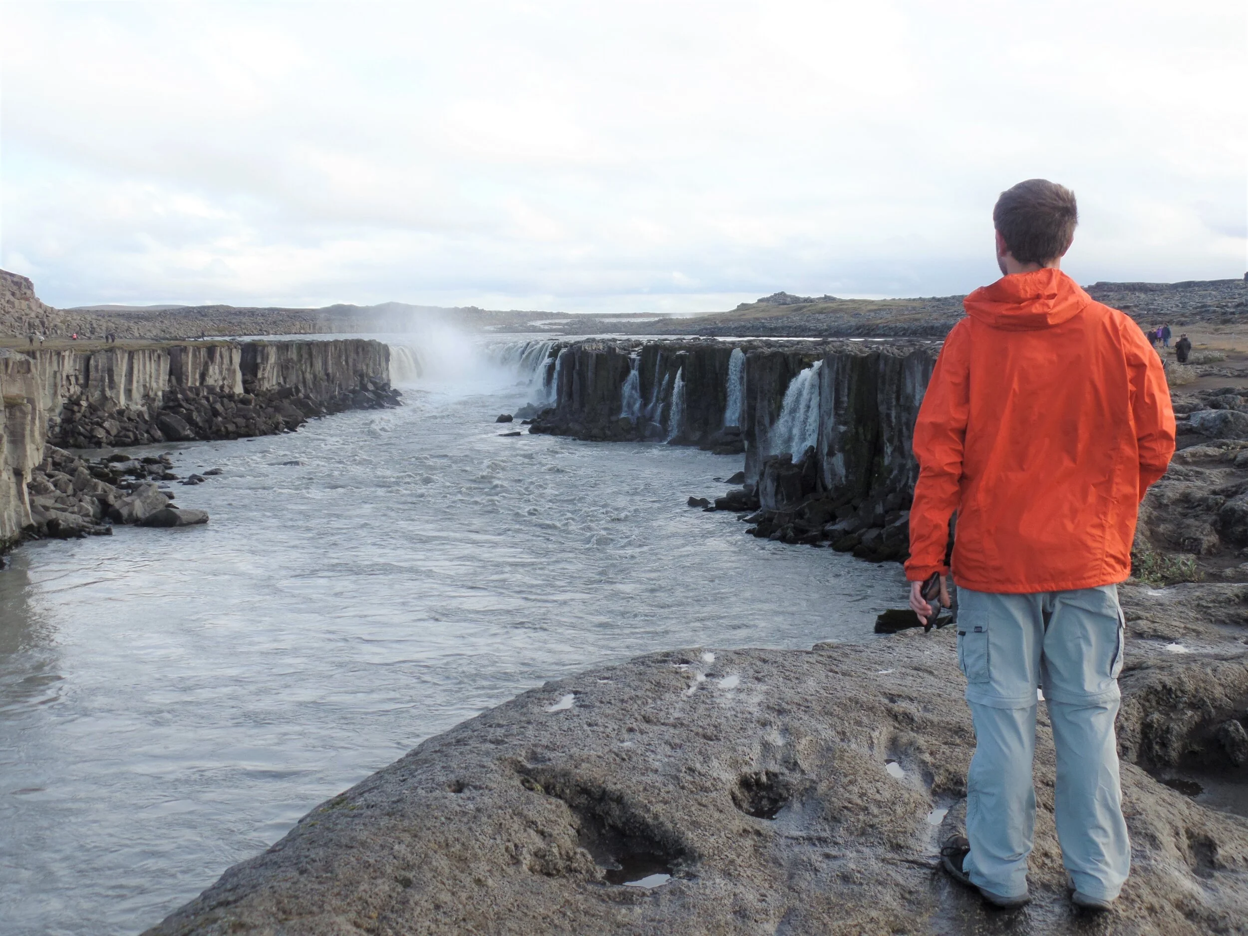 The west side is the more popular side. A paved road off the ring road will bring you to a large parking area with a visitor center and free bathrooms. From here, the walking trail to Dettifoss is less than a kilometer through cool rock and basalt features. There are lower and higher vantage points along the trail near the waterfall…be sure to wear grippy shoes and watch your step on the wet slippery rock here.