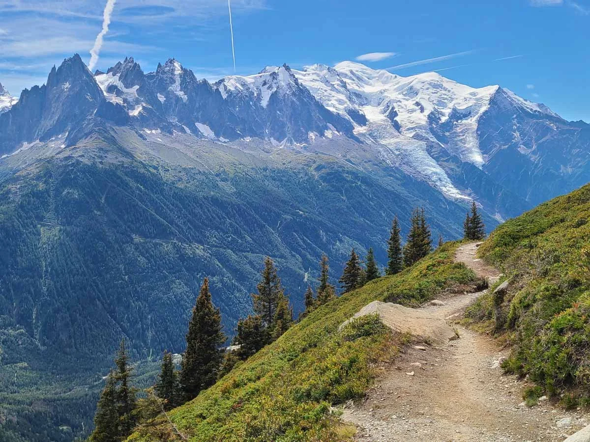 From the trail, you’ll have great views over Chamonix Valley and the peaks of the Aiguilles Rouge on the other side, Mont Blanc will be behind you, and the jagged peaks of the French Alps will be hovering over you on the southern side of the valley. And these epic views are non-stop.