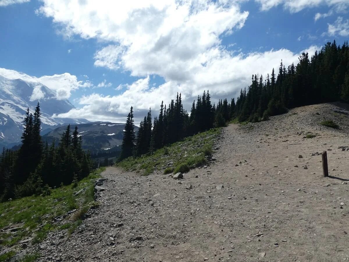 Looking back along the Sourdough Ridge Trail to Mount Rainier and Sunrise