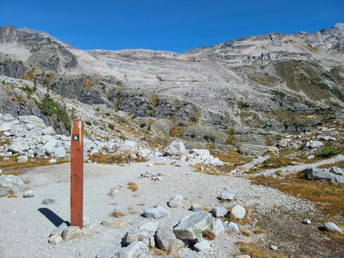 However, when you’re at this sign, there’s a herd path that goes up the small hill to your right. Up here, you’ll find the amazing campsite #8 that we talked about above, but continue past that out to the edge of this hill, and you’ll get a fantastic view overlooking Hermit Meadows, Mount MacDonald, the Rogers Pass area beyond, and the mountains and glaciers of the Illecillewaet and Asulkan Valleys in picture-perfect view. We stayed up here for a while eating lunch and taking it all in. It does get windy up here, so make sure you have some layers!