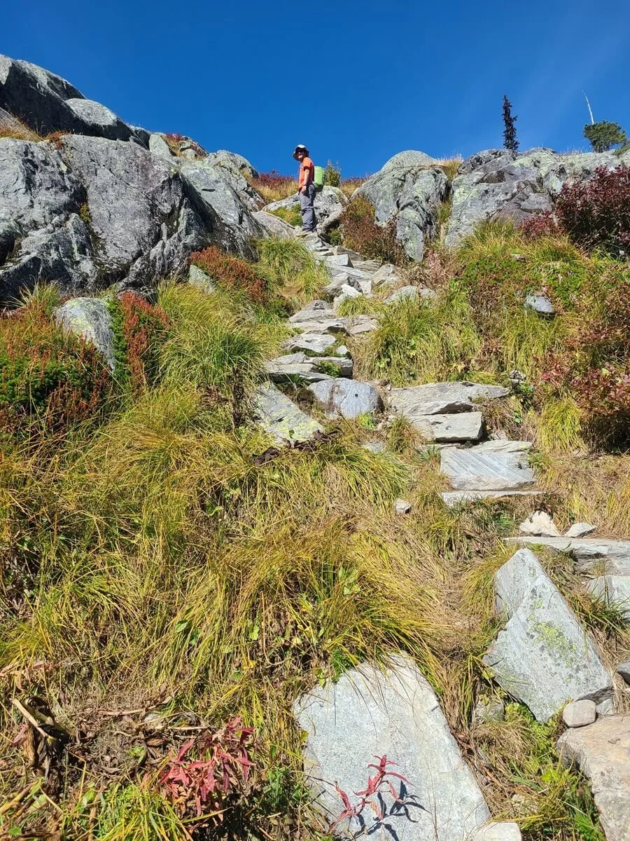 Walking stone steps across a grassy slope just below Hermit Meadows