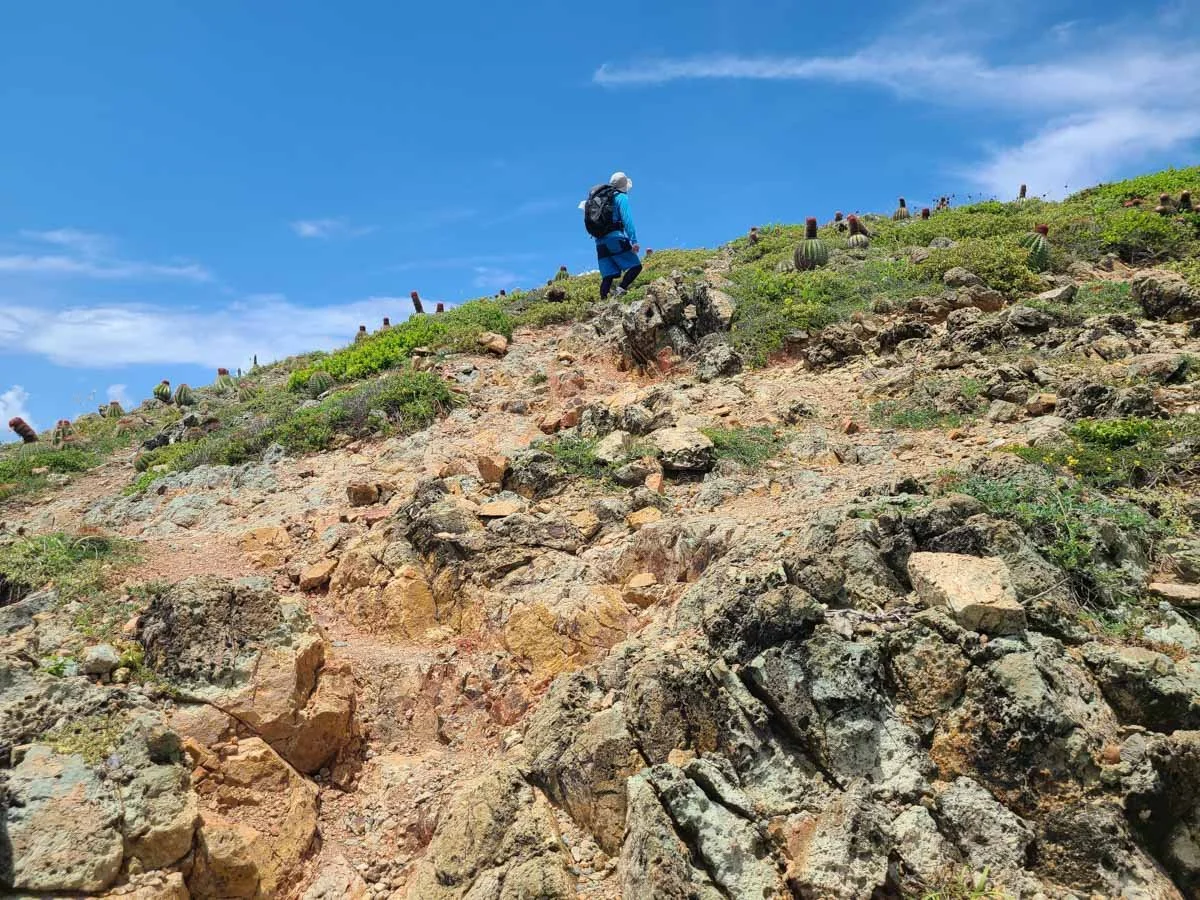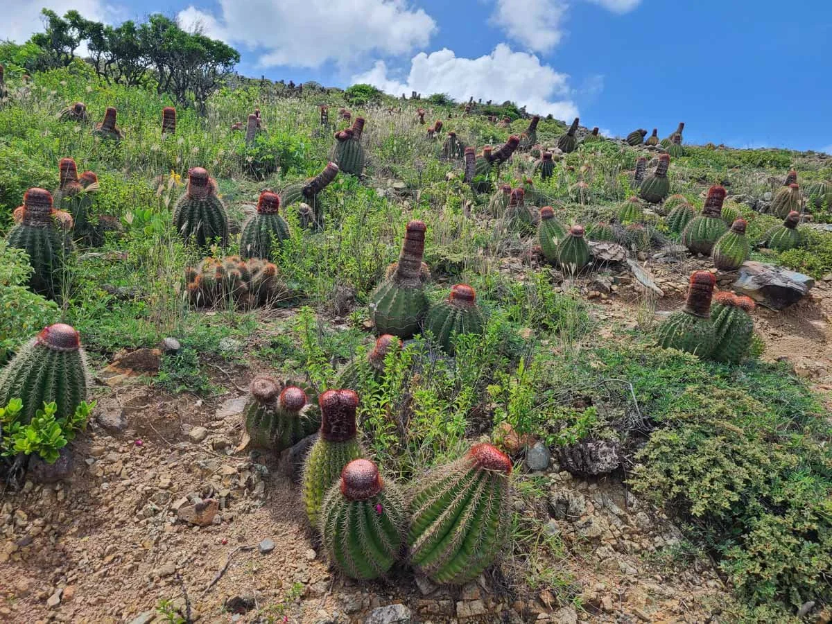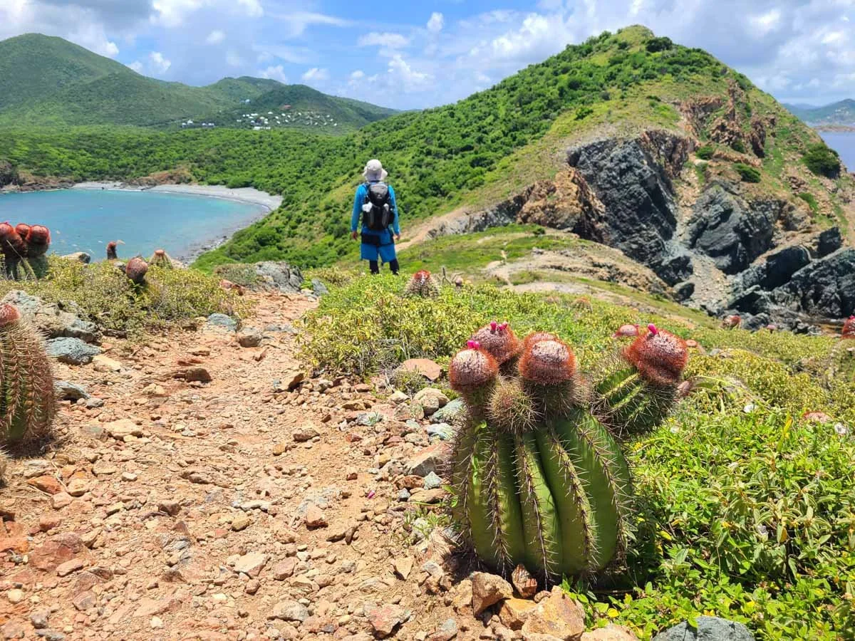 Once on the final section of the hike, you’ll walk through huge patches of beautiful barrel cacti, which make this landscape so unique and picturesque. At this point, don’t forget to keep looking behind you, as views of St. John’s south shore come into view.