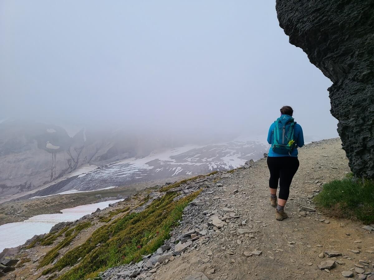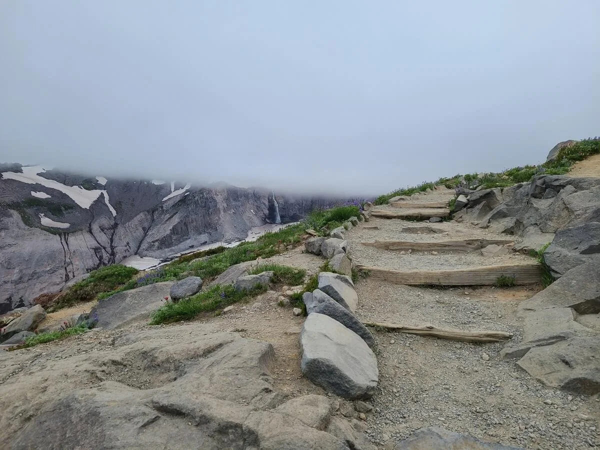 The trail wraps around a ledge overlooking Mount Rainier and the Nisqually Glacier. Without the fog, this would be an absolutely stunning in-your-face view of the mountain!
