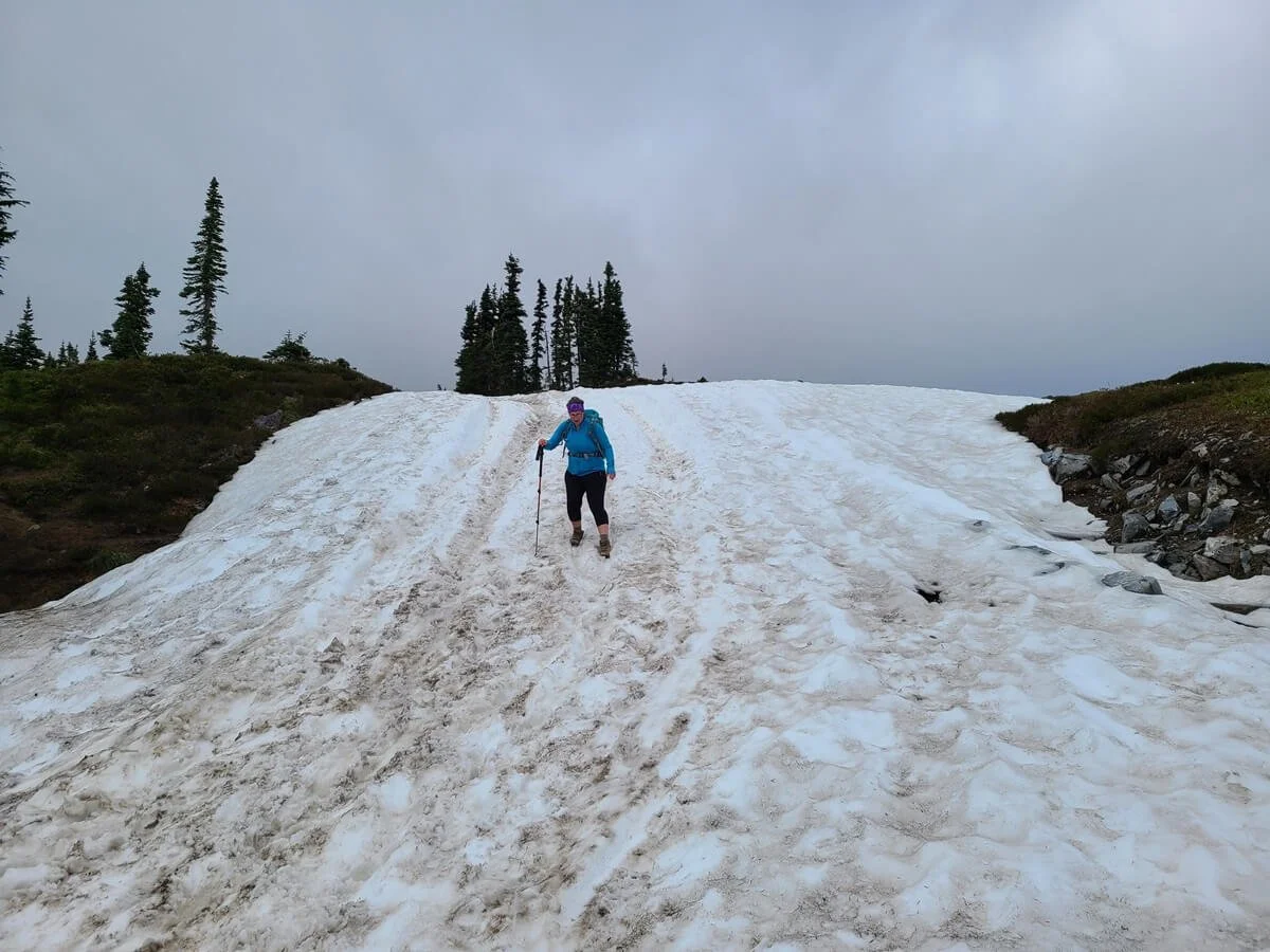 This half of the Skyline Loop Trail often holds onto its snow late into summer, so it’s likely that you’ll encounter some big snow patches over here. In mid-July, we had to cross several, and they were all on pretty steep slopes along the trail, making them extra slick and slippery.