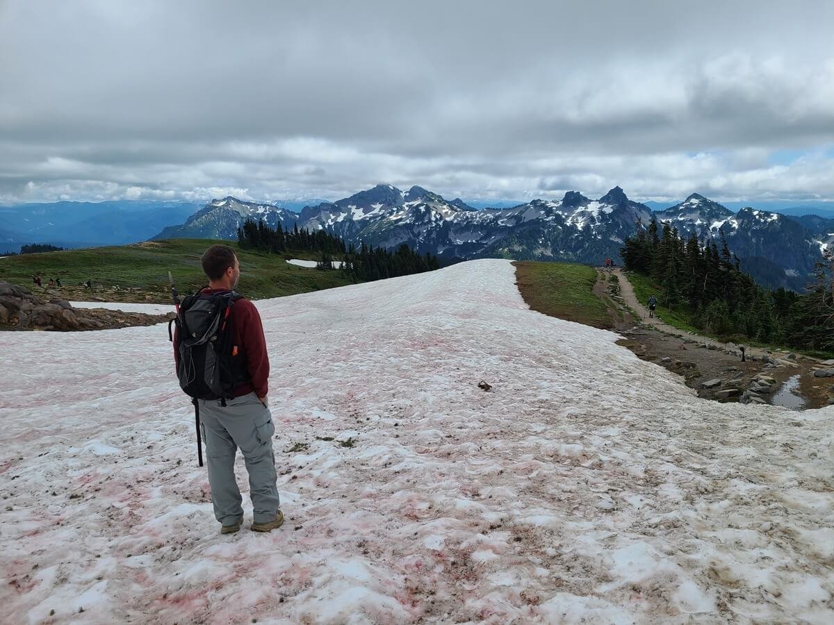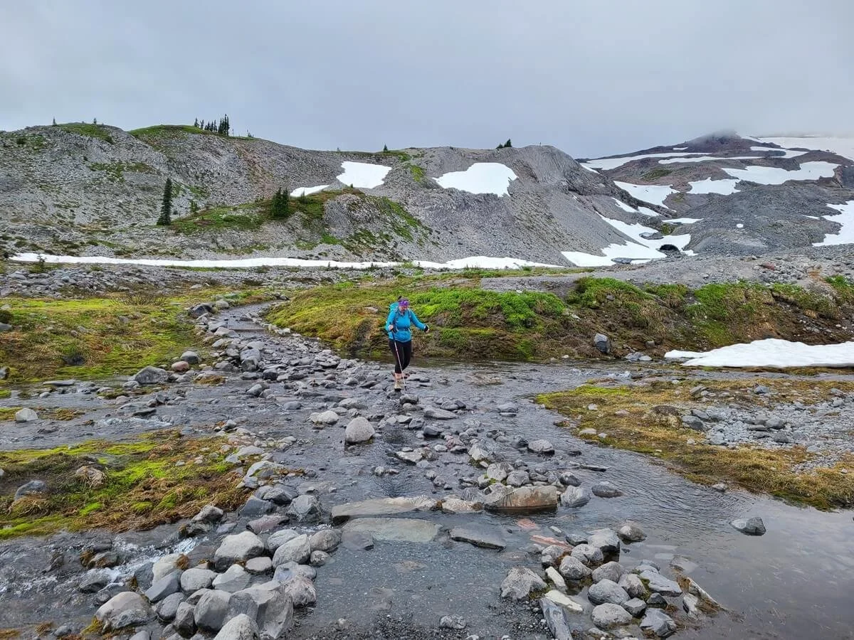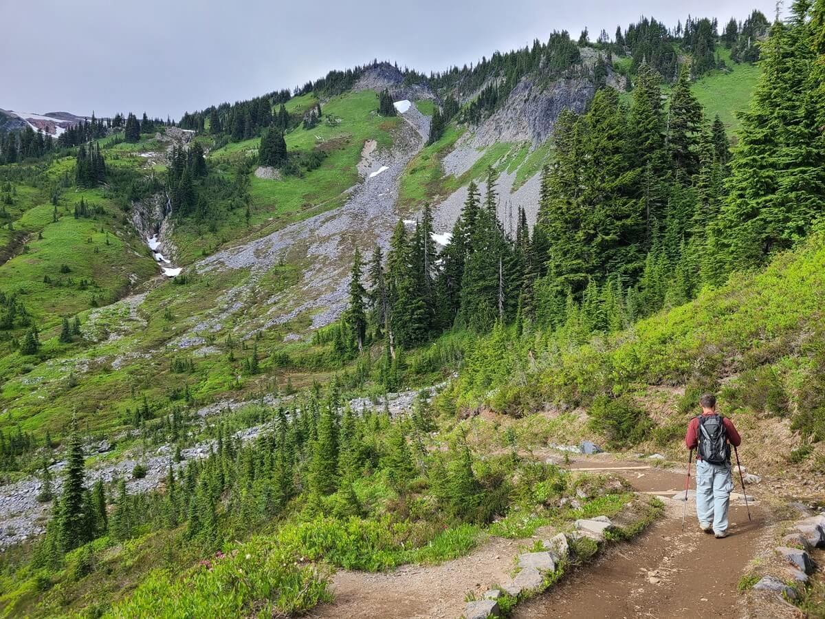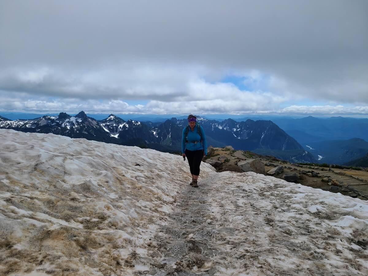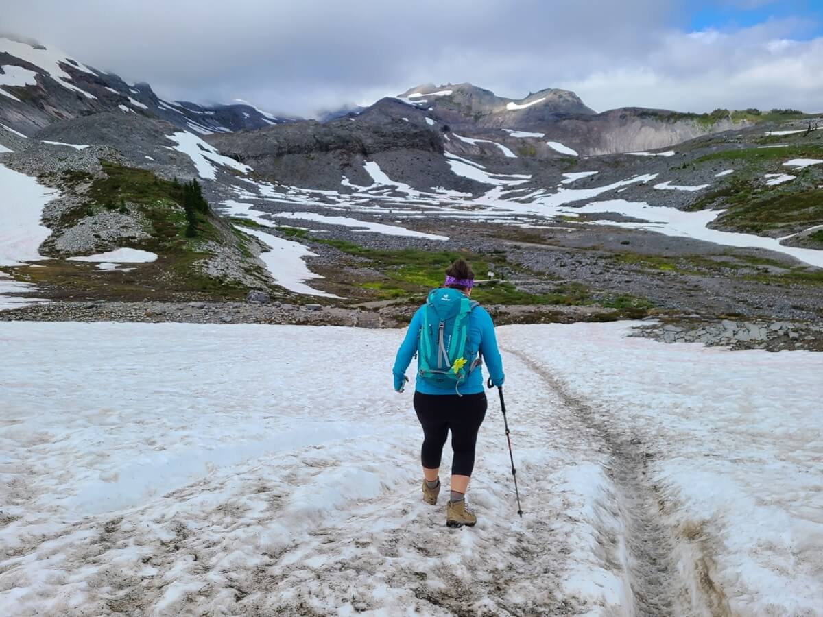 We would say that the Skyline Loop Trail in Mount Rainier is moderately challenging. There’s a good amount of elevation gain, and while the first part of the loop in either direction starts off deceptively easy on a nice paved walking path, the trail eventually becomes rocky, steep, and sometimes narrow. As you head up to Panorama Point, you’ll be hiking through more alpine-like territory with rugged terrain and cooler weather. The Skyline Loop Trail also holds onto snow until late in the season, and you’ll likely find yourself crossing several snow patches along the trail, particularly on the eastern half of the loop. We hiked the Skyline Loop Trail in mid-July and crossed probably a half dozen or so patches found on both sides of the loop. They can get slick so having poles is really helpful.