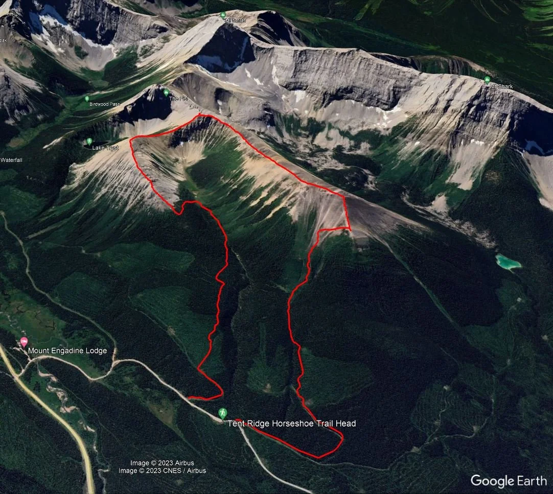 A satellite shot of our hike on the Tent Ridge trail in Kananaskis